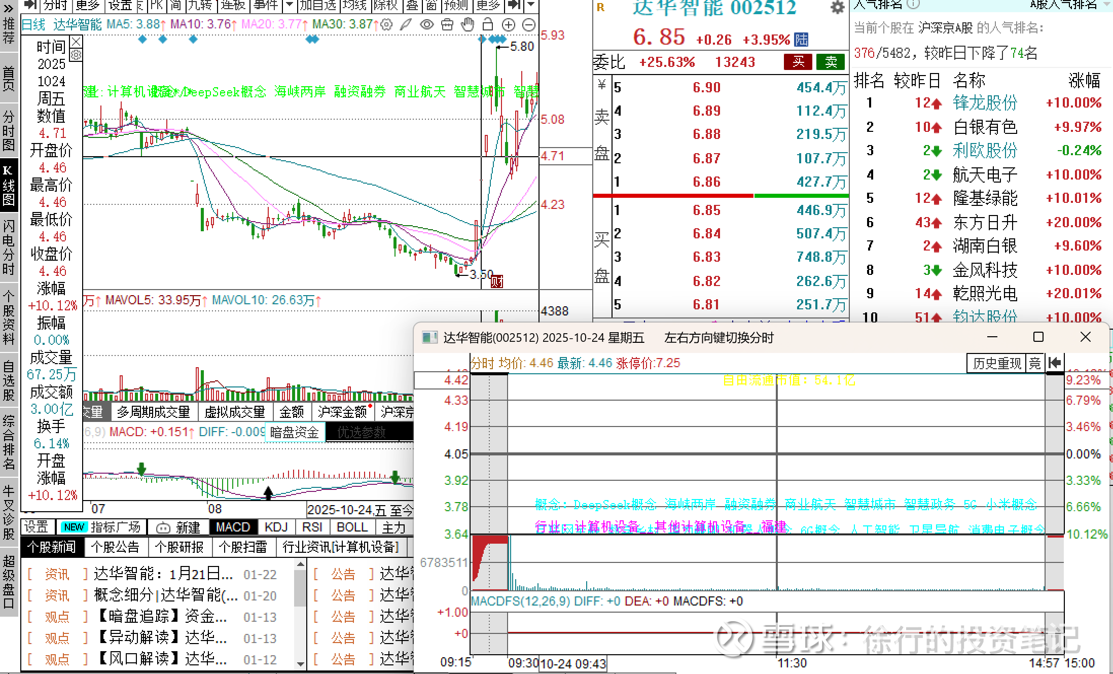 我们来看一些例子。2025.10.24这天海峡两岸题材中达华智能(地处福建福州)一字,同身位的平潭发展(地处福建福州)换手,双双晋级二板。达华智能是兔子,平潭发展是乌龟。在这个例子里面,达华智能就不是正宗性更强,炒作价值更大的那个,它是信创题材里面一个比较有辨识度的票,股性活跃,经常借助各种利好刺激拉几个板。而平潭作为距离台湾岛最近的地区,大家仅仅凭借名字和F10就可以明显判断出平潭发展的正宗性和关联度高于达华智能。这里面龟兔地位就错配了,真正的龙头是乌龟。