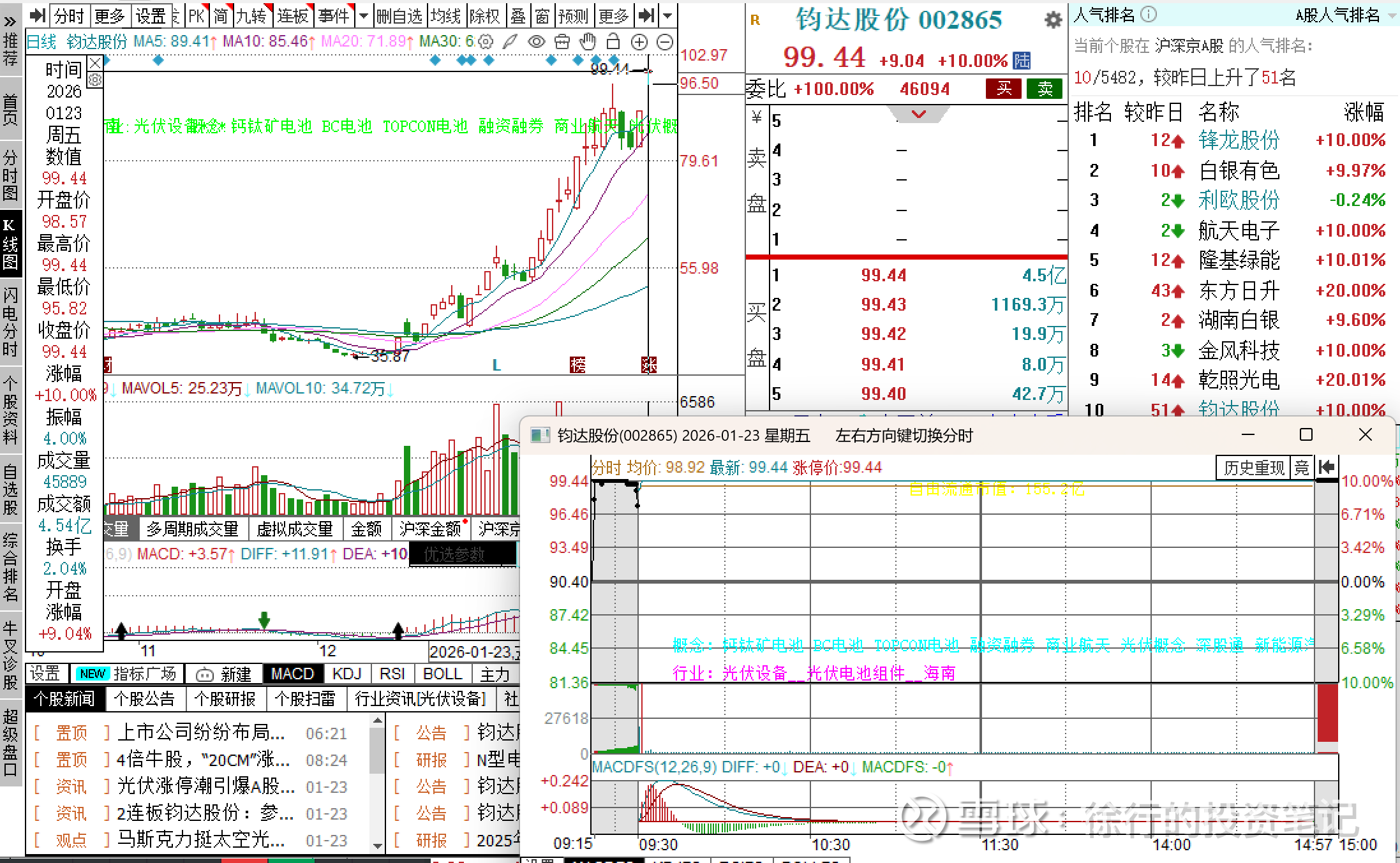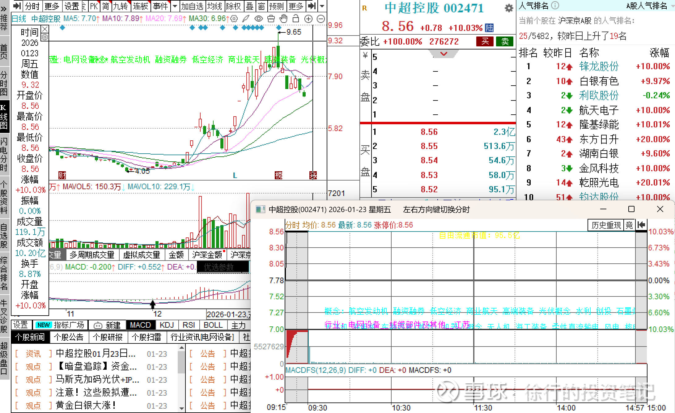 最近有一个新的例子。本周五2026.1.23商业航天题材的中超控股在利好公告(公司控股孙公司江苏精铸近期再接某火箭单位40套推力室顶盖毛坯订单,产品已配套航天科工火箭、上海空间推进研究所等,深度参与商业航天)刺激下继续顶一字,同身位同题材的钧达股份厂字换手晋级。中超控股是兔子,钧达股份是乌龟。我想这里面也存在龟兔地位错配。中超控股25年因核电/商业航天等消息刺激频繁异动,是一支股性比较活跃的有一定辨识度的股票。而钧达股份是当下商业航天最强细分——太空光伏概念里面正宗性很强的票,它在太空光伏板块的领涨很显著,更有可能成长为龙头。