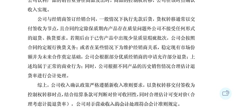 三季报回复函已明确说明,营业收入商品只要发货到供应商仓库并签收,商品权已转移。在商品品质无问题的情况下公司就可以确认收入,这是公司一直以来的确认收入方式,也是快销上市公司行业确认收入审计标准规定。退货商品在产品无问题不接受退货,三季报回复函中65万退款金额也是包装有问题退货。