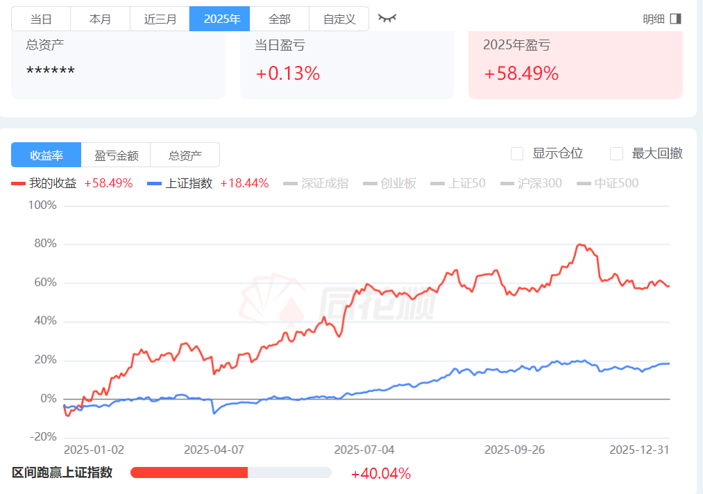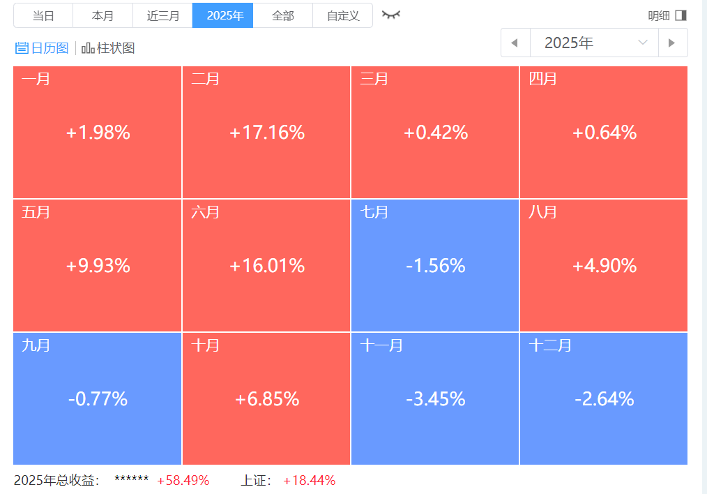 今年收益率58.49%,整体基本上都是满仓操作,中间回撤幅度也不小。
