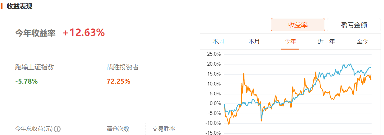 短线账户的收益图如下,虽然收益率不高,但我尽量截图完整点,更清晰一点,全年资金账户也没有转入新资金,也没有转出过。(之前看到有人实验过,年末资金转出之后分母变小,可以让收益率统计有差异。)