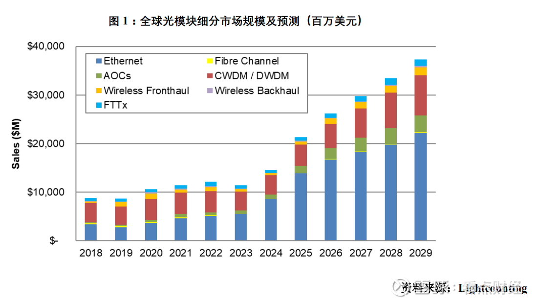 Lightcounting 预测,光模块的全球市场规模在 2024-2029 年或将以 22%的 CAGR 保持增长,2029 年有望突破 370 亿美元。
