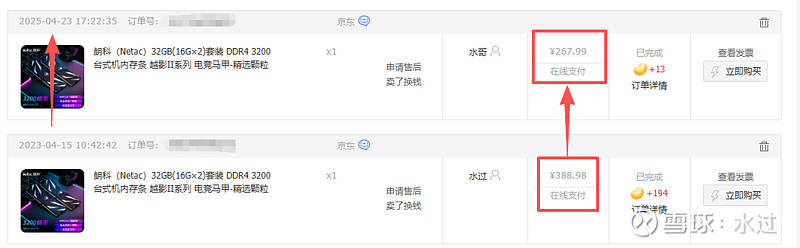 我2023年四月份配的电脑,当时买的朗科 32GB(16G×2)套装 DDR4 3200 = 388元,两年后就是去年2025年四月份,我看到内存可能要涨价的消息,立马去买了一模一样的套条268元,还降价了120元: