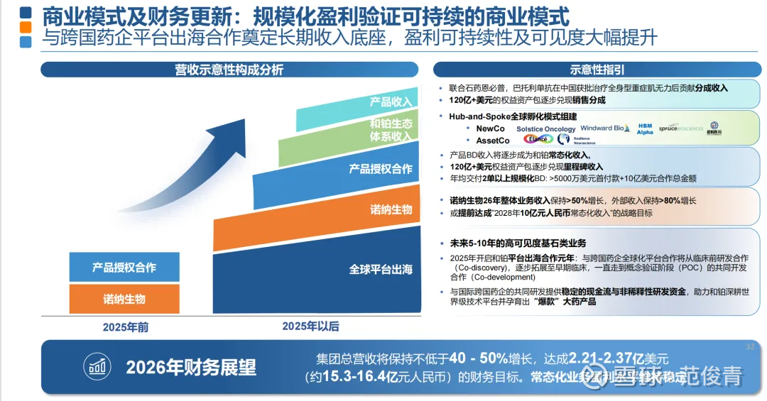 2026年公司明确核心目标:总营收保持40%-50%增长,达2.21-2.37亿美元,去年扣非归母净利润为1.01亿美元。公司说常态化盈利水平保持稳中有升,从其目前收入结构看的更清晰些,在2025年之前主要依靠产品授权合作(主要靠首付款)和诺纳生物研发合作贡献收入,而在去年开始,随着合作产品的推进,里程碑也开始入账,同时公司也依托平台与资源打造自身孵化体系(股权增值的体现),加上未来更多产品走向成熟上市带来销售分成,便可看出稳中有“升“的爆发力。研发费用今年会有较多提升,提升幅度可能会超过营收增长。