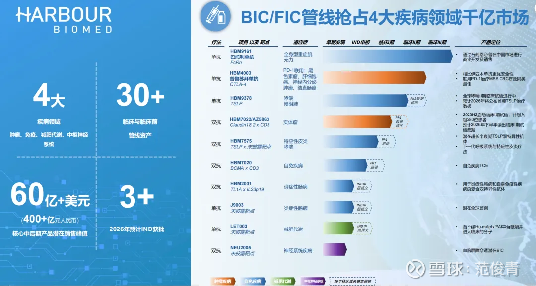公司管线覆盖“肿瘤、免疫、减肥代谢、中枢神经”四大疾病领域,拥有30+临床/临床前资产,核心产品潜在销售峰值超60亿美元,多款产品具备BIC/FIC潜力,自免与肿瘤管线进入收获期。