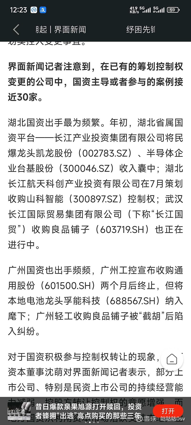 $山科智能(SZ300897)$ 炒新不炒旧,湖北还差一个20cm的只有你一个了在已有的筹划控制权变更的公司中,国资主导或者参与的案例接近30家。湖北国资出手最为频繁。年初,湖北省属国资平台——长江产业投资集团有限公司将民爆龙头凯龙股份(002783.SZ)、半导体企业台基股份(300046.SZ)收入囊中;湖北长江航天科创产业投资有限公司在7月策划收购山科智能(300897.SZ)控制权;