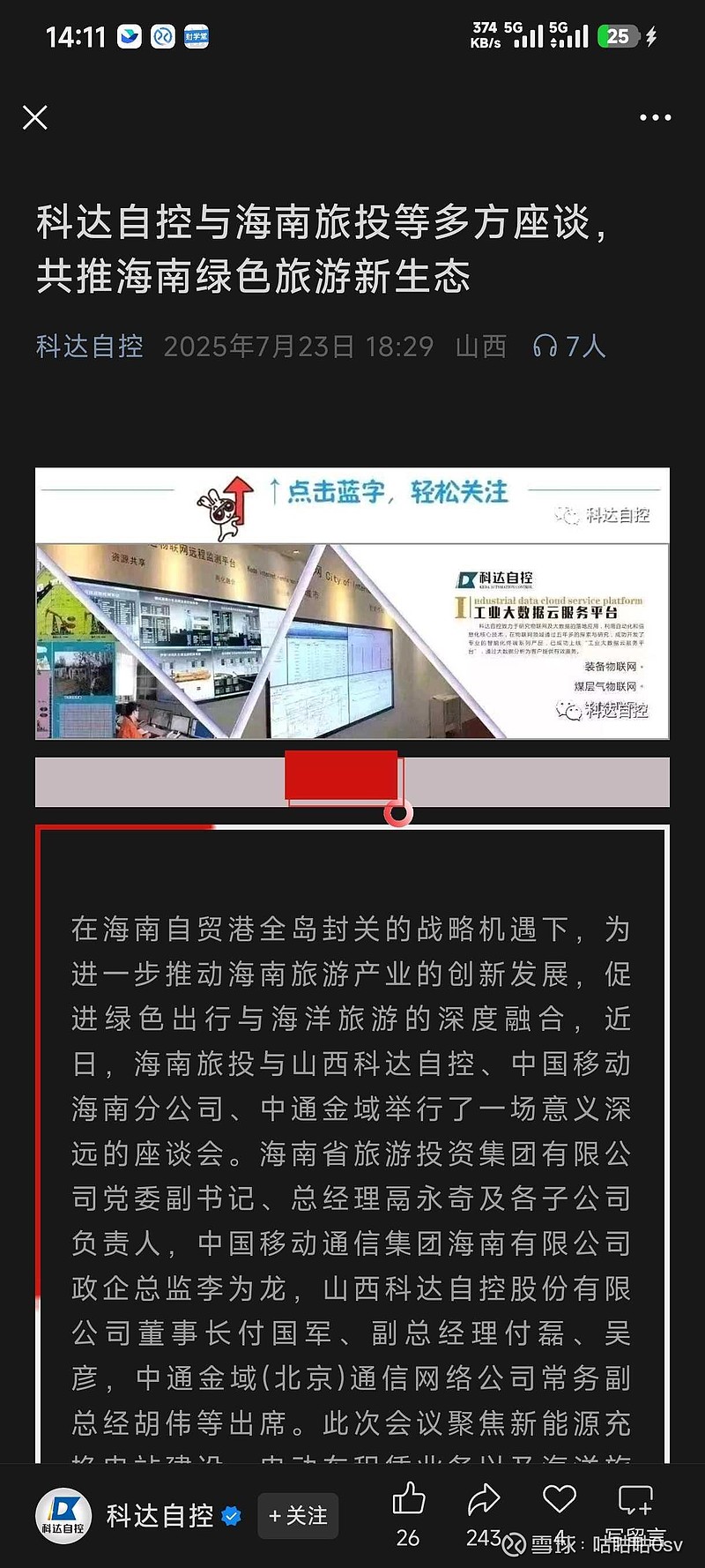 $科达自控(BJ920932)$ 低位潜伏点,看看后没有主板的海南情绪外溢。海南自贸港封关为新能源与旅游融合提供了政策沃土,科达自控将以此次座谈为契机,深化与各方协同,通过技术创新与资源整合,共同推动海南旅游交通服务升级,为自贸港旅游高质量发展注入绿色动能。