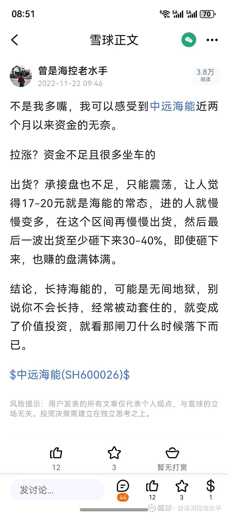 当时海能在17-20元震荡了快两个月,我已经看到头部迹象了,无论从股性还是从基本面来看都显示这个迹象,所以当时发帖提示投资者,但他们不了解我,还说我在酸海能,我也没必要解释那么多。