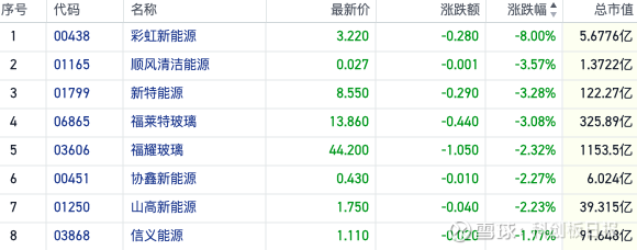截至发稿,彩虹新能源(00438.HK)跌超8%,顺风清洁能源(01165.HK)跌近4%,新特能源(01799.HK)、福莱特玻璃(06865.HK)均跌超3%,信义能源(03868.HK)、协鑫新能源(00451.HK)跟跌。