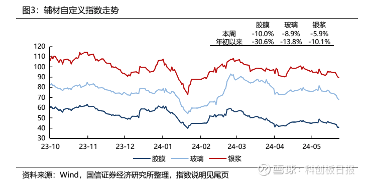 另据国信证券电新团队跟踪数据显示,5月胶膜、玻璃、银浆等光伏辅材的价格也全线下跌。可见行业景气度仍有待修复。