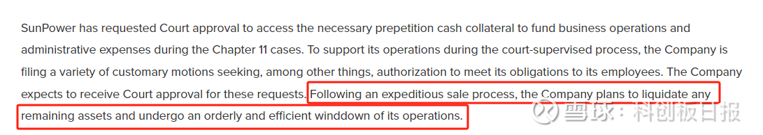 虽然美国《破产法》第11章是破产重组程序,但SunPower在周一的新闻稿中确认,“在加快出售程序之后,公司计划清算所有剩余的资产,并对业务进行有序和高效的清盘。”
