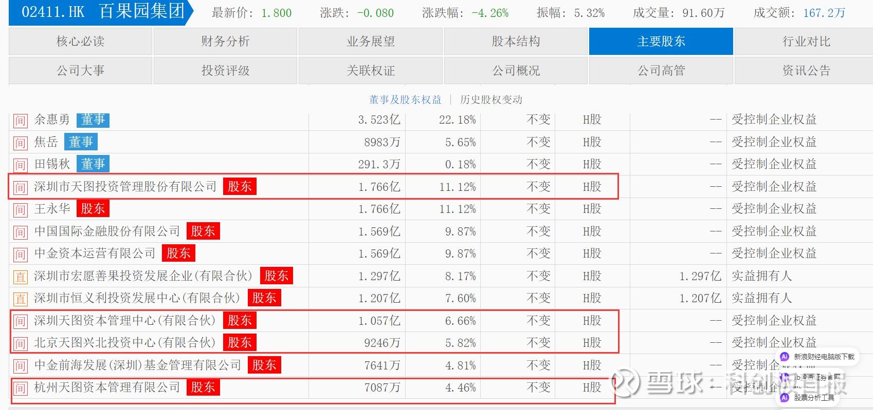 百果园2023年年报显示,天图投资及旗下基金仍是百果园的重要股东,4只股权投资基金持股占比较高,且上市后一直没有抛售。