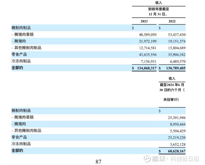 据最新的招股书显示,2022年、2023年以及截至2024年6月30日,腌肉制品贡献的营收分别为8839.3万美元、8327.6万美元和3975.2万美元;在各期总营收的占比分别为67.17%、61.94%和57.92%;而零食产品在报告期内的营收分别为3590.6万美元、4363.6万美元和2521.9万美元;占比分别为27.48%、32.83%和36.75%。