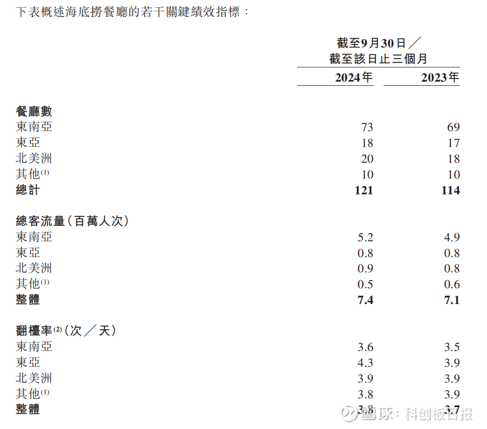 整体平均翻台率为3.8次/天,2023年同期为3.7次/天。总客流量超过740万人次,较2023年同期的710万人次同比增长4.2%。同店销售额增长率为5.6%。经营溢利率为7.5%,2023年同期为5.7
