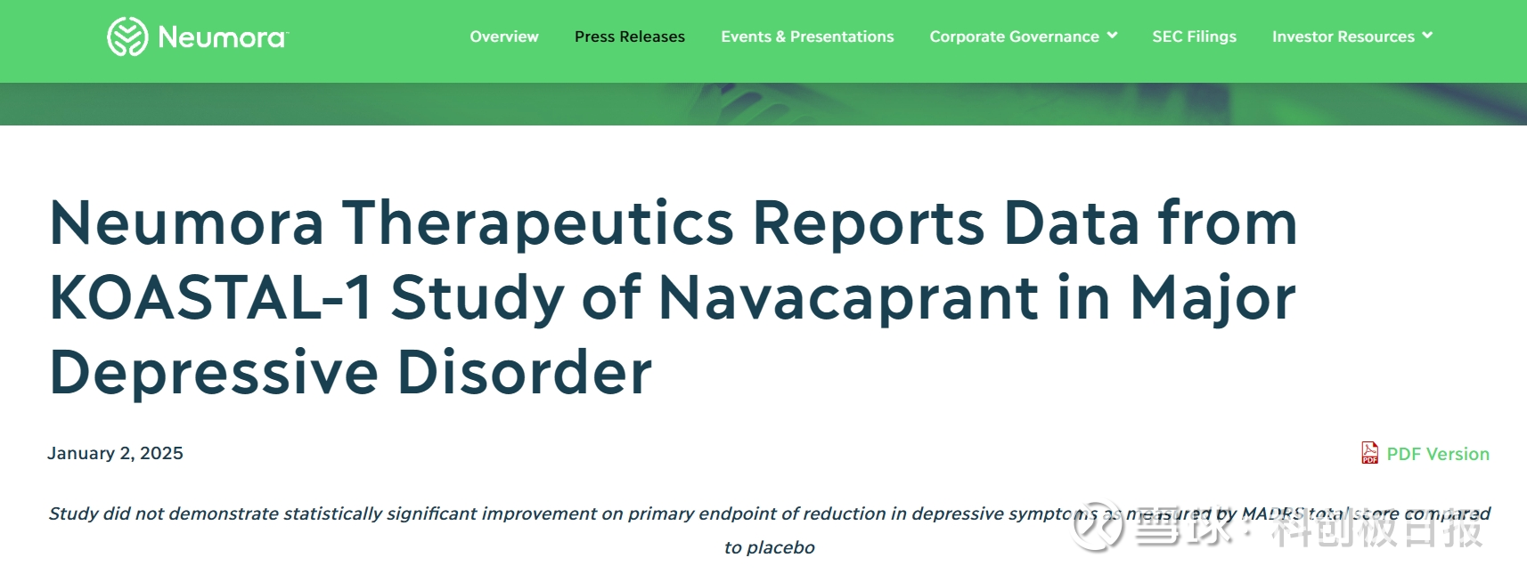 财联社1月2日讯(编辑 牛占林)美东时间周四,脑部疾病创新药开发公司Neumora宣布,其用于治疗重度抑郁症的实验性药物在最后阶段的研究中未能显示出明显疗效。这一消息导致其股价盘中暴跌逾80%,创下上市以来的最大单日跌幅。