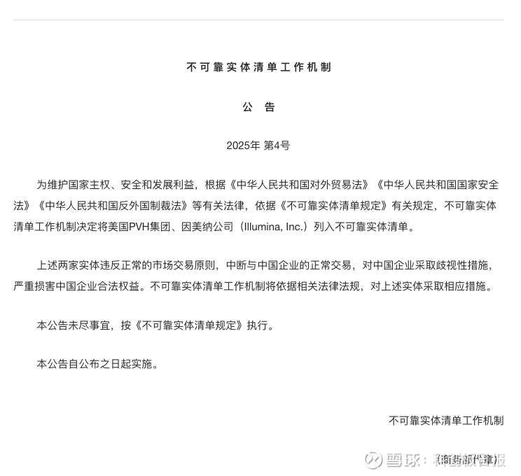 公告称:为维护国家主权、安全和发展利益,根据《中华人民共和国对外贸易法》《中华人民共和国国家安全法》《中华人民共和国反外国制裁法》等有关法律,依据《不可靠实体清单规定》有关规定,不可靠实体清单工作机制决定将美国PVH集团、因美纳公司(Illumina, Inc.)列入不可靠实体清单。