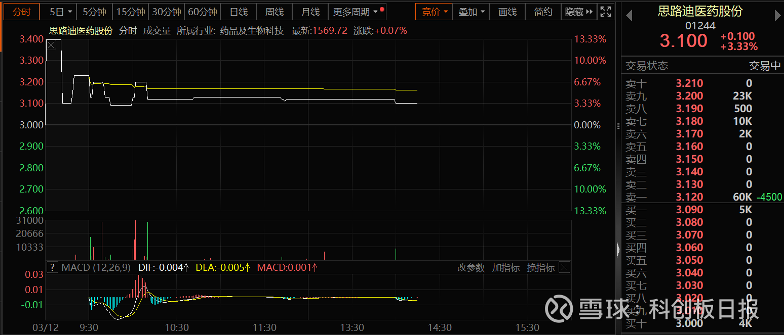 《科创板日报》3月12日讯(记者 邱思雨) 今日(3月12日)上午,思路迪医药股份股价(01244.HK)高开逾7%,截至发稿,涨3.33%。