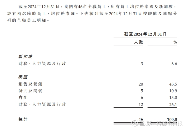 彻底“剥离”生产加工的投入和维护后,截至2024年底,IFBH只有46名全职员工,泰国43名、新加坡3名。其中销售及营销20人、仓配6人、研发5人,而财务、人事、行政总计15人。