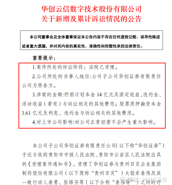8月14日,华创云信发布公告,子公司华创证券就纾困计划及股票质押纠纷,向贵州百灵大股东姜伟及其一致行动人姜勇、张锦芬等提起诉讼,目前法院已正式受理。