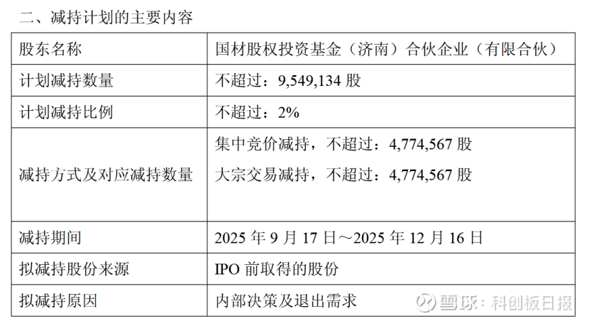 根据减持计划,国材基金通过集中竞价方式减持不超过4,774,567股;通过大宗交易方式减持不超过4,774,567股。减持期限为自公告披露之日起15个交易日后的3个月内实施。