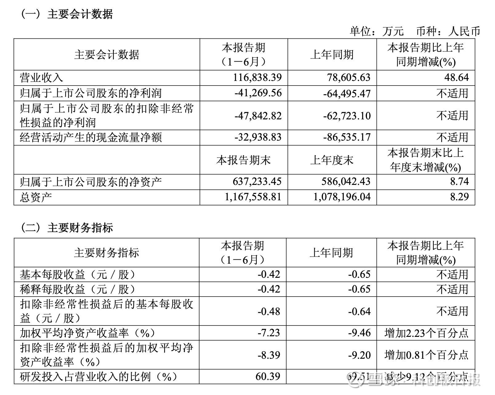 《科创板日报》8月26日讯(记者 黄修眉) 君实生物今日(8月26日)晚间公布2025年半年度财报显示,其实现营收11.68亿元,同比增长48.64%;实现归母净利润-4.13亿元,亏损同比收窄36.01%。