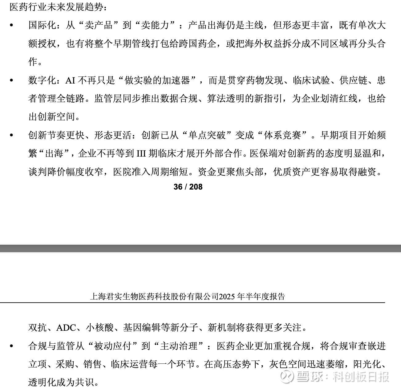 对于行业发展趋势,君实生物在财报中表示,2025年医药行业从“规模仿制”向“价值创新”跃迁,政策、资本、技术、国际化四重共振推动中国创新药发展。