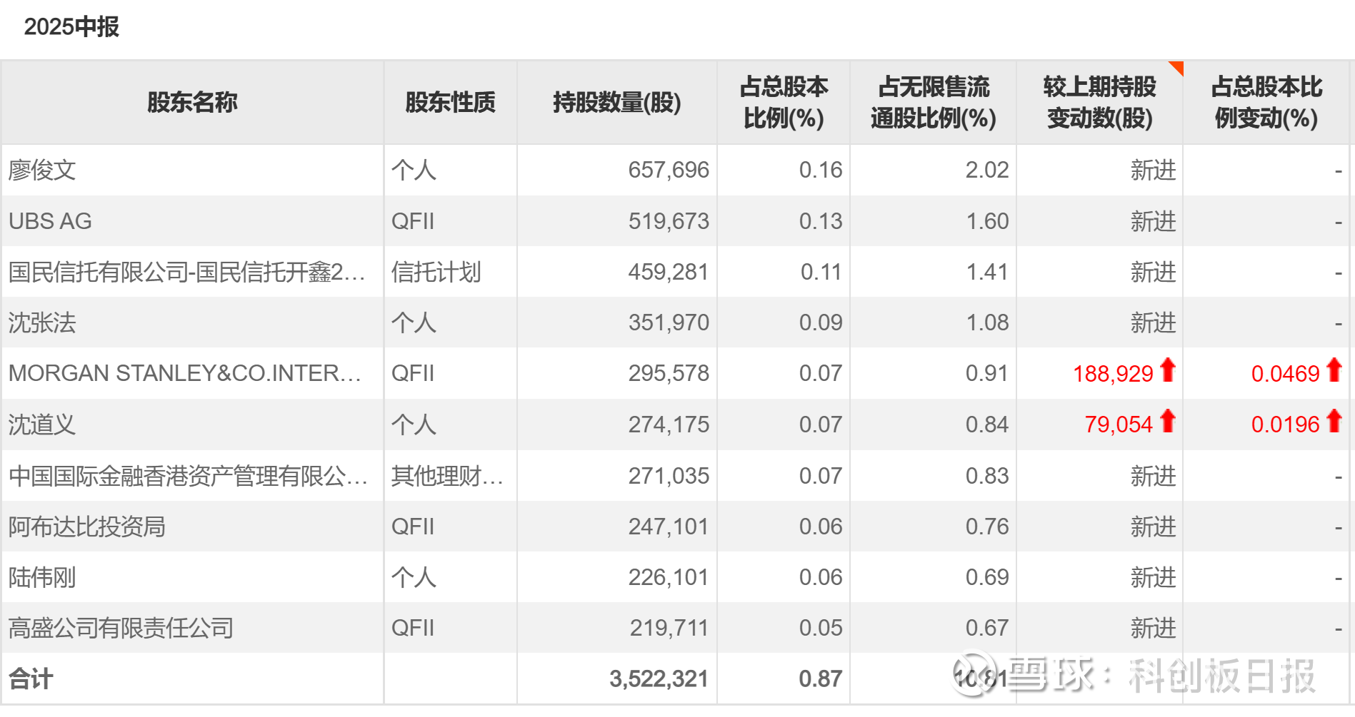 股东变化方面,胜科纳米前十大流通股东持股合计占比10.81%,廖俊文(65.77万股)、UBS AG(51.97万股)、国民信托有限公司-国民信托开鑫22号证券投资集合资金信托计划(45.93万股)、沈张法(35.20万股)、中国国际金融香港资产管理有限公司-CICCFT10(Q)(27.10万股)、阿布达比投资局(24.71万股)、陆伟刚(22.61万股)、高盛公司有限责任公司(21.97万股)成为新进股东;黎宝珠(31.63万股)、裴天续(30.29万股)、尹彦华(26.44万股)、杭州弈宸私募基金管理有限公司-弈宸宸音5号私募证券投资基金(12.70万股)、郭彦军(11.96万股)、敖翔(11.00万股)、刘桂森(10.01万股)、周治国(10.00万股)退出股东行列。