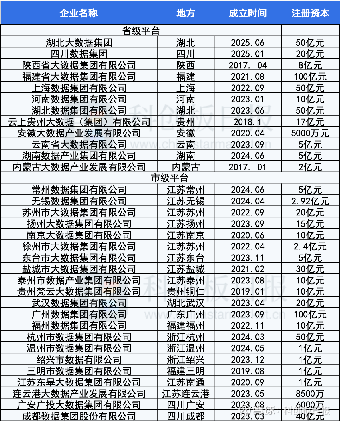 此前,湖北、江苏、陕西、湖南、湖北、河南、福建等省已组建省级数据集团。广州、杭州、武汉、温州等地也组建了相应的市级数据集团公司。