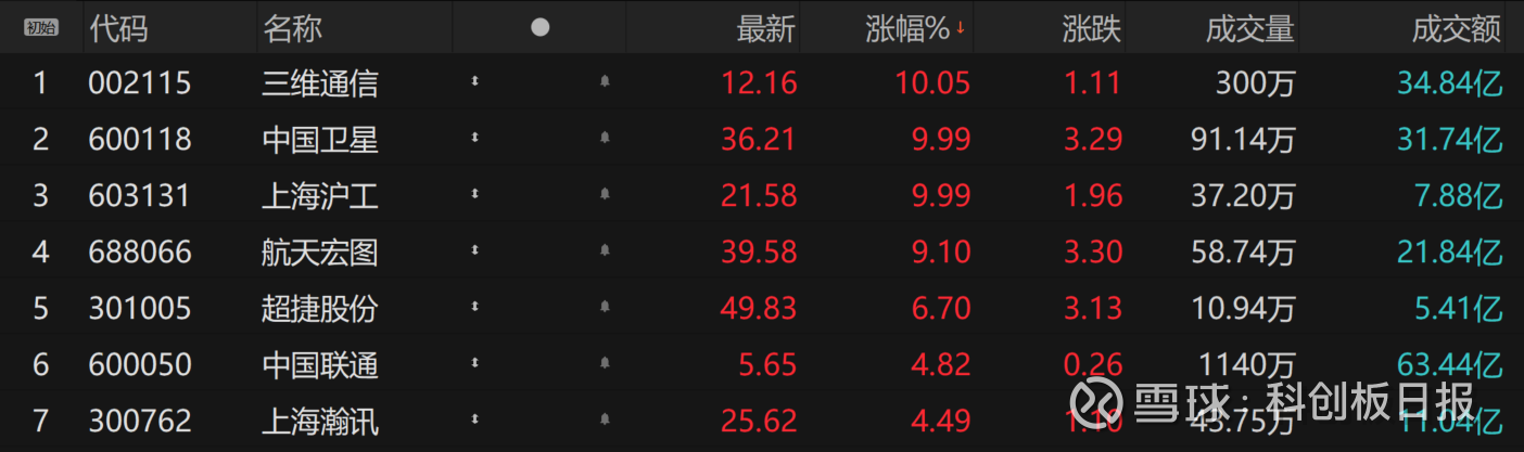 受该消息影响,今日午后卫星互联网概念再度走强。截至收盘,三维通信、中国卫星、上海沪工等多股涨停,航天宏图涨超9%,中国联通涨超4%,超捷股份、上海瀚讯等跟涨。