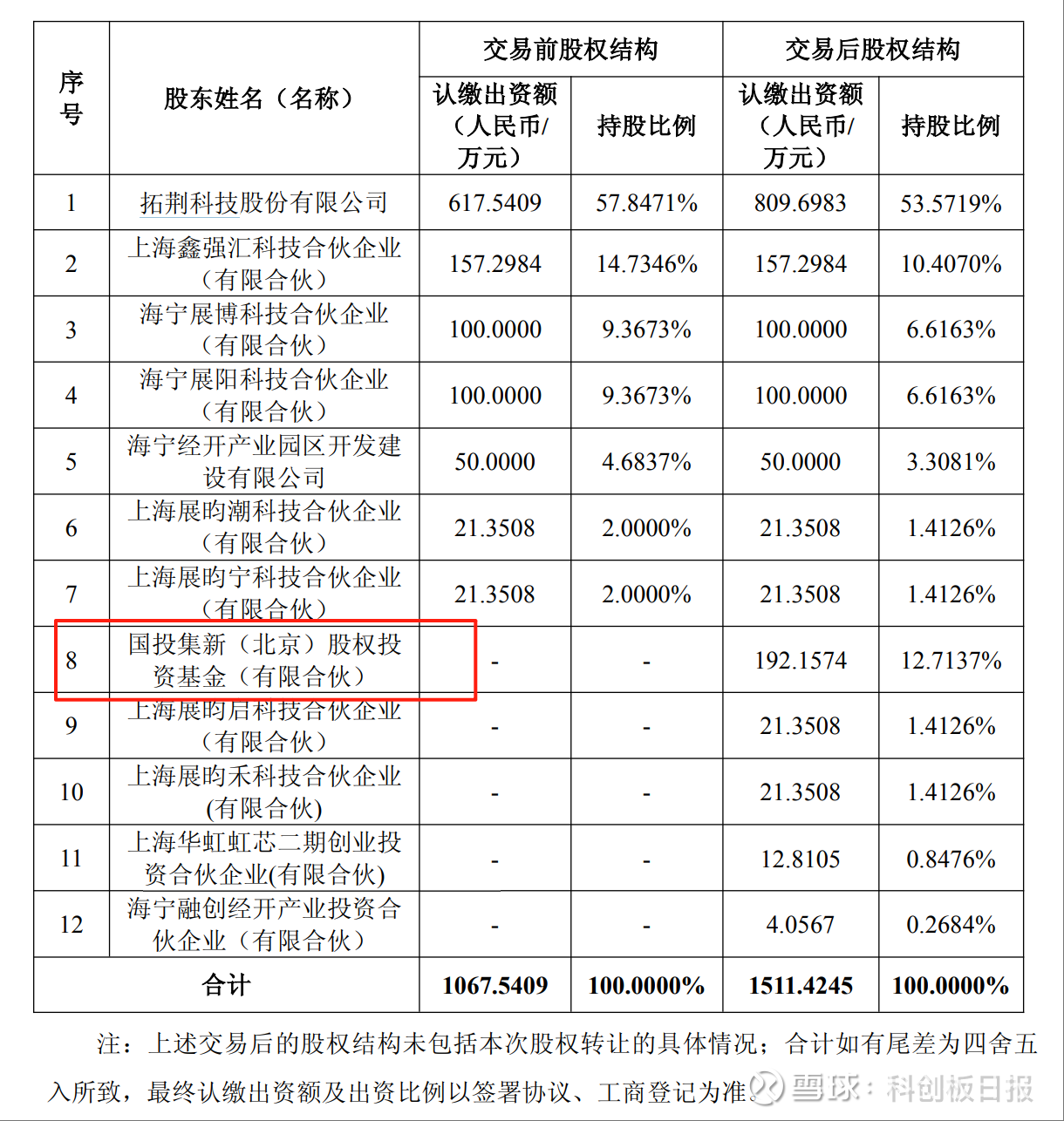 国投集新(北京)股权投资基金(有限合伙)(下称“国投集新”)拟以不超过人民币4.5亿元,认缴拓荆键科新增注册资本人民币192.1574万元。