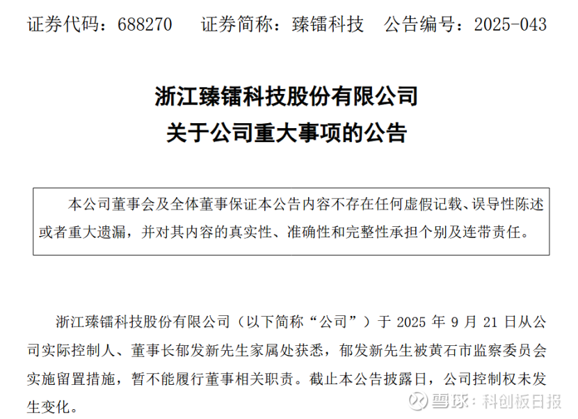 《科创板日报》9月21日讯(记者 吴旭光) 今日(9月21日)晚间,臻镭科技发布公告,公司于2025年9月21日从公司实际控制人、董事长郁发新家属处获悉,郁发新被黄石市监察委员会实施留置措施,暂不能履行董事相关职责。