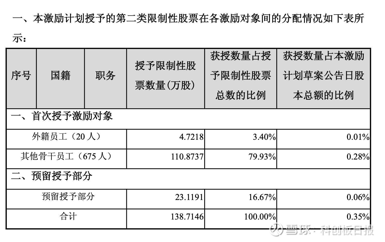 其中,首次授予115.5955万股,约占激励计划草案公告日(9月24日)公司股本总额的0.29%,首次授予部分约占本次授予权益总额的83.33%;预留授予23.1191万股,约占激励计划草案公告日(9月24日)公司股本总额的0.06%,预留授予部分约占本次授予权益总额的16.67%。