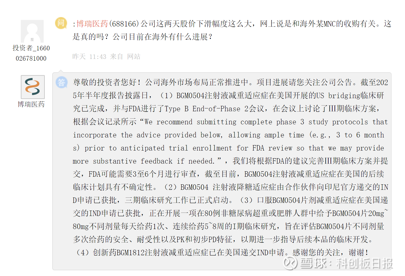 在上证e互动平台,有投资者提问博瑞医药股价大跌是否与海外MNC收购有关,对此,博瑞医药并未做出正面回答,只是就目前其核心管线BGM0504注射液 (GLP-1/GIP双靶点)和口服片剂在国外的临床进展进行了回应,并披露旗下长效Amylin类似物BGM1812针对减重的适应症已在美国递交IND申请。