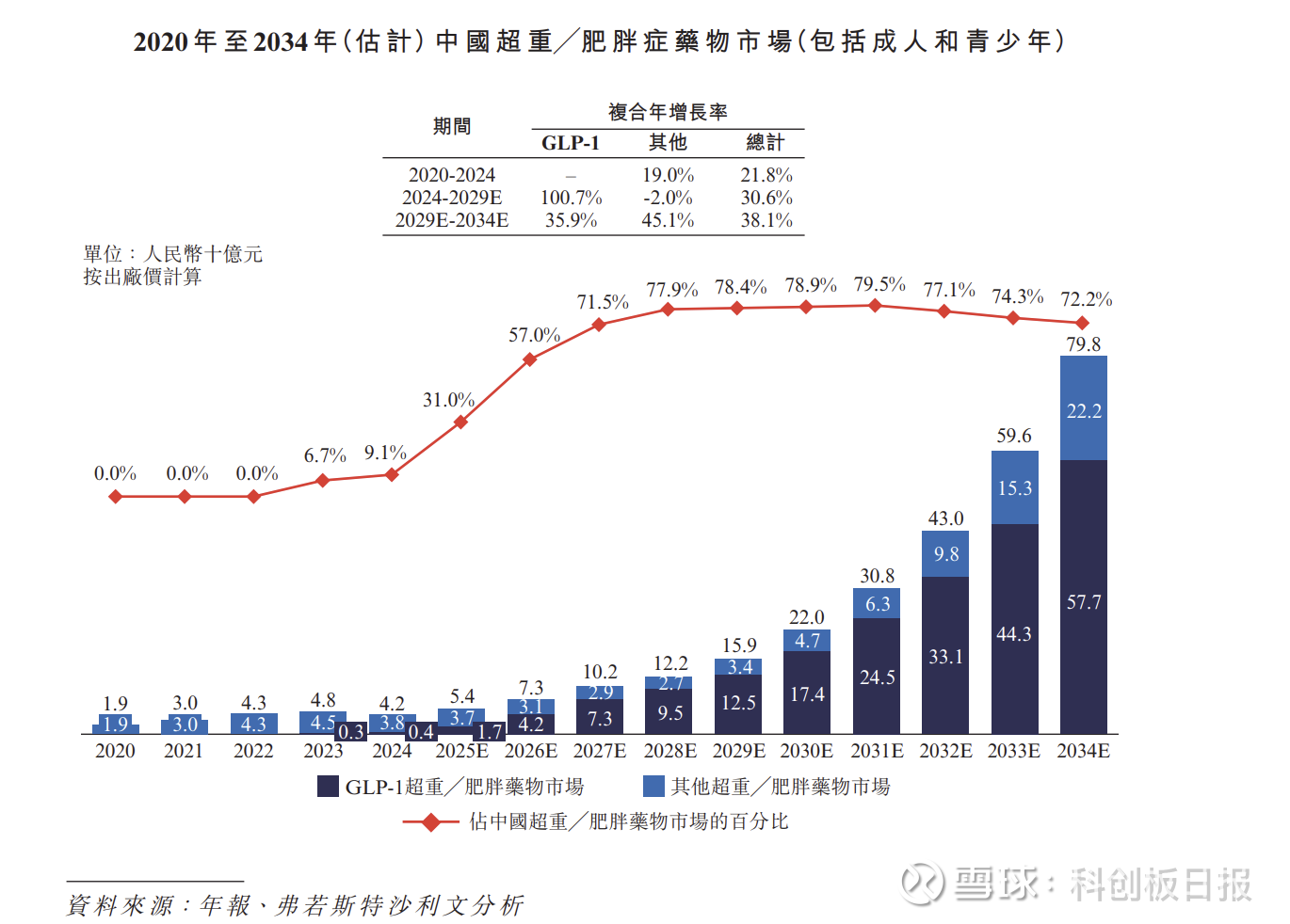 根据弗若斯特沙利文分析数据,2024年中国超重/肥胖药物市场规模为2亿元,预计2029年将达到159亿元。其中,GLP-1药物用于减肥适应症的市场规模预计2029年将达到125亿元,市场份额也将同步上升至78.4%。
