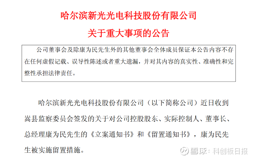 《科创板日报》9月28日讯(记者 吴旭光) 今日(9月28日)晚间,新光光电发布公告,近日收到嵩县监察委员会签发的关于对公司控股股东、实际控制人、董事长、总经理康为民的《立案通知书》和《留置通知书》,康为民被实施留置措施。
