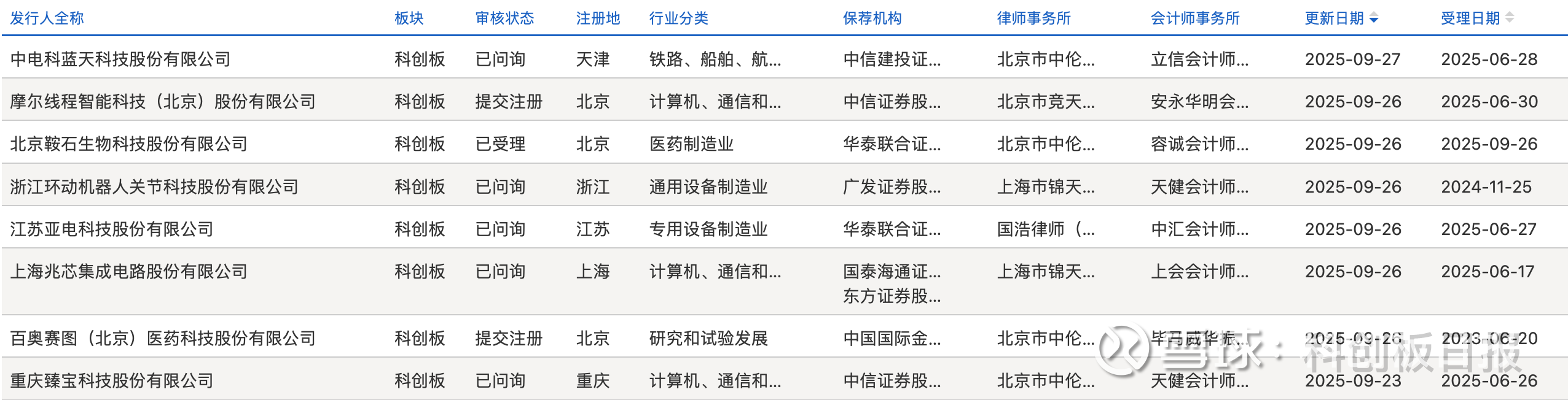 其中,鞍石生物IPO申请获受理;摩尔线程、百奥赛图科创板IPO提交注册;电科蓝天更新首轮审核问询回复;臻宝科技更新招股书和首轮审核问询回复;环动科技更新招股书和第二轮审核问询回复;亚电科技与兆芯集成更新招股书。