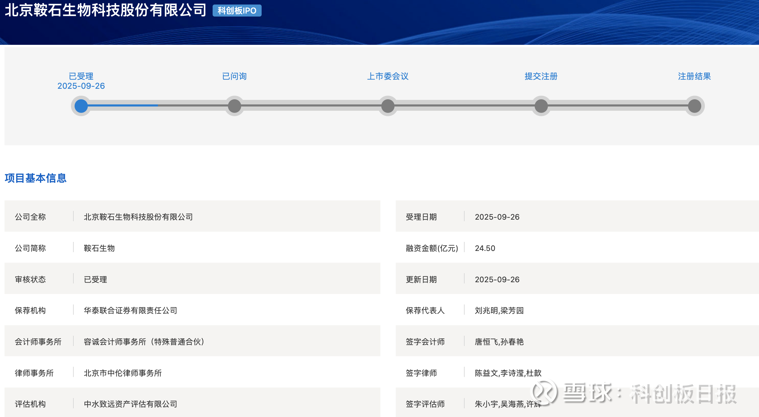 鞍石生物成立于2018年,是一家迈入商业化阶段的创新生物医药企业,专注于肿瘤等存在重要未满足临床需求的疾病领域。其IPO申请于9月26日获受理,采用科创板第五套标准申报。