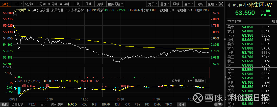 《科创板日报》9月29日讯(编辑 宋子乔) 9月29日,小米集团(01810.HK)午后一度跌超3%,最终收跌2.01%。