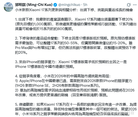 另外,郭明錤表示,小米17系列还面临来自iPhone、华为手机的竞争压力: