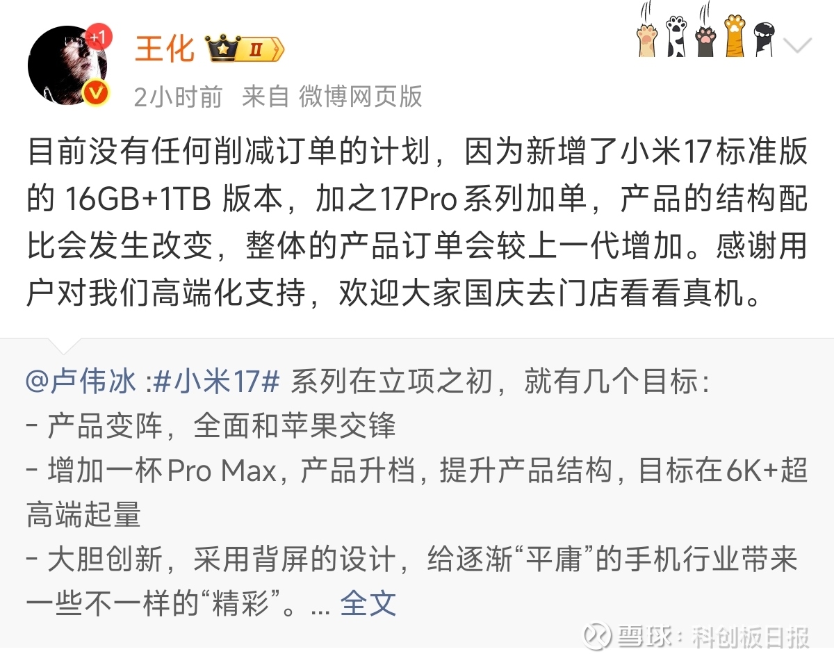 郭明錤发布下调出货量报告的同日,小米集团总裁卢伟冰发文称,小米17系列首销虽才过2天,但销量已经非常不错,“小米17系列有信心销量会比上代小米15系列更多。”他透露,三杯中,小米17 Pro Max卖得最好,Pro其次,轻松跨过6K+门槛,产品结构得到历史性的改善。今天小米也增加了Pro的订单。上代标准版1TB版本销量比例比较低,所以这一代没有上1TB,但早期已经完成了技术验证。产品发布后,用户对小米提出了严厉的批评,小米马上决策增加1TB版本的量产,并会在10月5号开始交付。这也对标准版首销产生了一些影响。