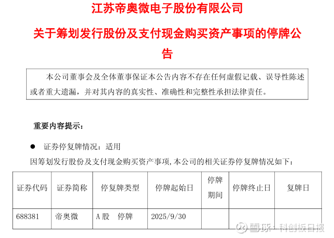 帝奥微表示,因本次交易尚存在不确定性,为了保证公平信息披露、维护投资者利益,避免对公司股价造成重大影响,根据上海证券交易所的相关规定,经公司申请,公司股票已于2025年9月29日开市起停牌,并将于2025年9月30日开市起继续停牌,预计停牌(累计)时间不超过10个交易日。