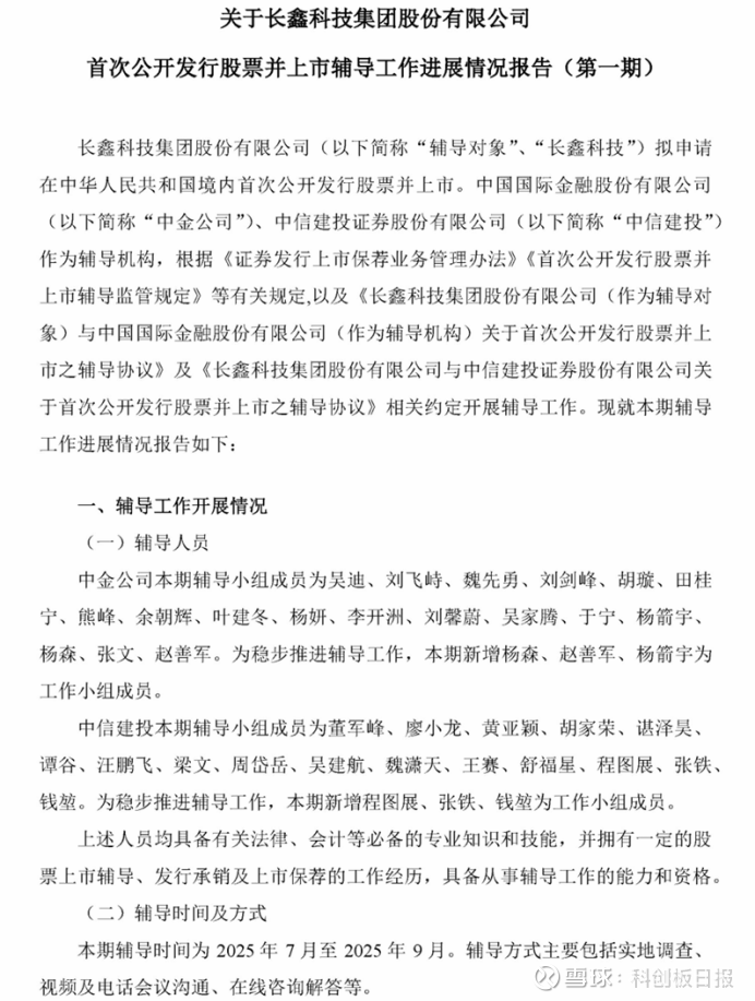 财联社10月9日讯(记者 林坚)长鑫科技发布辅导进展第一期公告。公告末尾来自保荐机构的辅导人员密密实实的签字,很是令人吃惊——中金公司、中信建投联合担任辅导机构这单项目,共有34人签字。