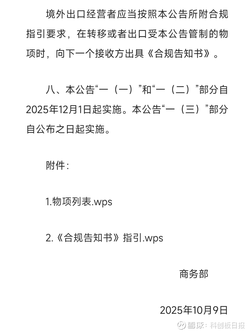 商务部10月9日发布2025年第61号公告,对含有中国成分的部分境外稀土相关物项实施出口管制。除管制规则外,附件采用WPS格式,要求相关申请文件须以中文提交两大细节引发热议。据悉,10月9日之前最新的两个公告,文件都是word或pdf格式。