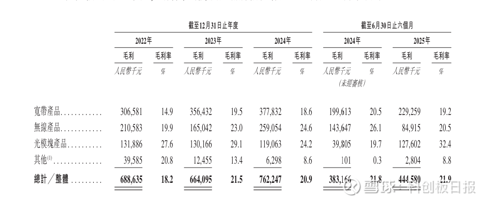 分产品来看,宽带产品是该公司的主要收入来源,收入占比常年在54%至60%区间。另外,2025年上半年,公司光模块产品的收入为3.94亿元,占比提升至19.4%,而2024年的占比约13.5%。
