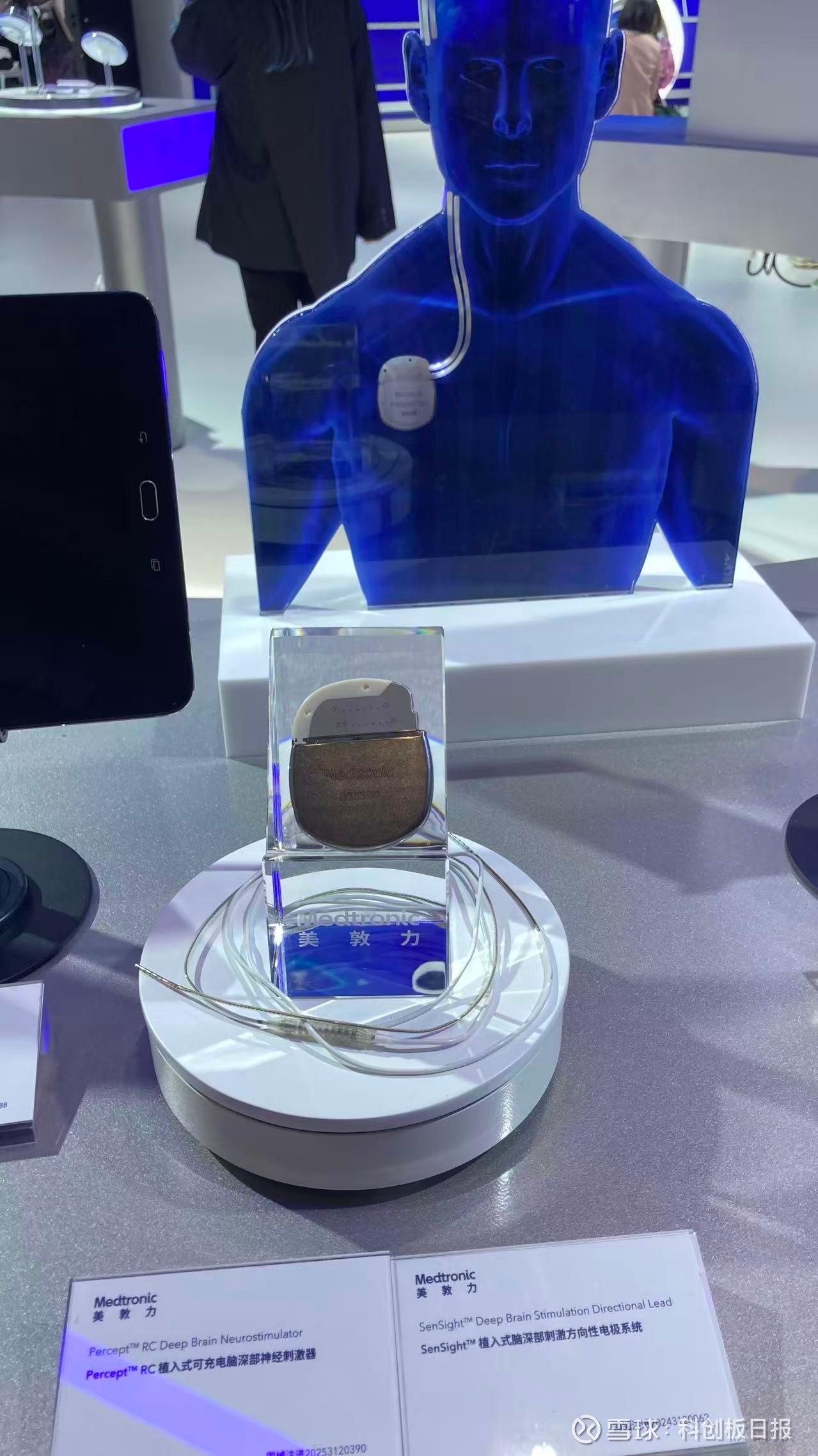 另一款来自美敦力的可充电、可感知闭环脑起搏器Percept RC,则是同时融合了人工智能和脑机接口技术。展台工作人员介绍:“这款设备不仅能实时监测大脑信号,还能根据患者的不同状态自动调整治疗方案,实现‘读脑-释义-反馈-疗愈’的完整闭环”。据悉,该产品在去年完成进博首展后,今年随即获批并即将在国内投入临床应用。