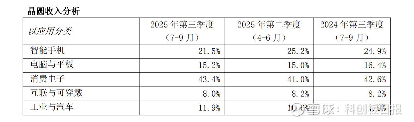 从第三季度收入构成来看,工业与汽车收入占比继续提升,2025年第三季度占比从Q2的10.6%升至11.9%;智能手机收入占比降至21.5%。