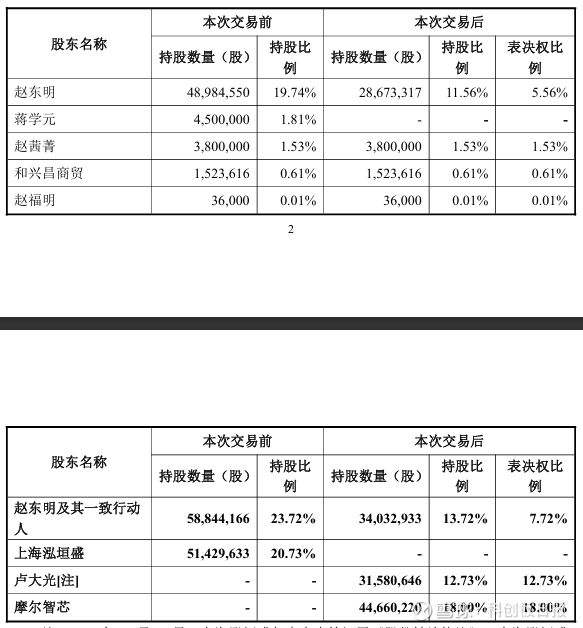 本次交易完成后,摩尔智芯持有禾盛新材18.00%的股份,赵东明及其一致行动人持有禾盛新材3403.29万股股份(占公司总股本的13.72%),并放弃禾盛新1488.67万股份(占公司总股本的6%)的表决权,禾盛新材控股股东变更为摩尔智芯,实际控制人变更为谢海闻。