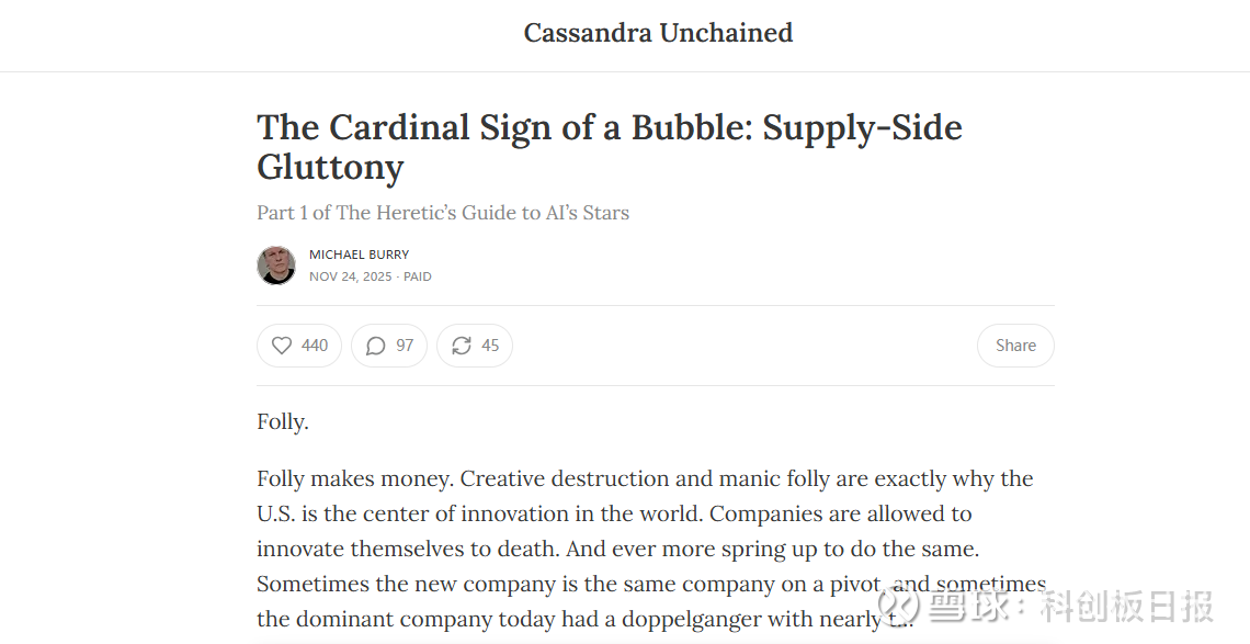 他在一篇名为《泡沫的根本标志:供给侧贪婪》(The Cardinal Sign of a Bubble: Supply-Side Gluttony)的文章中指出,人工智能的繁荣是一种“辉煌的愚蠢”,并指出英伟达是他预计该行业泡沫何时破裂的先兆。