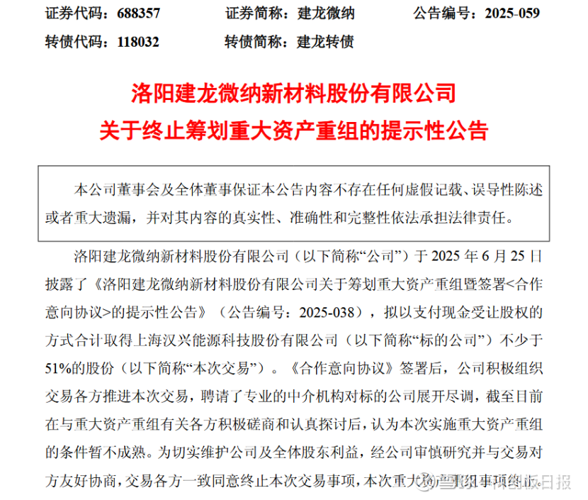 《科创板日报》11月27日讯(记者 吴旭光) 11月26日晚间,建龙微纳发布公告,经公司审慎研究并与交易对方友好协商,交易各方一致同意终止本次重大资产重组事项。