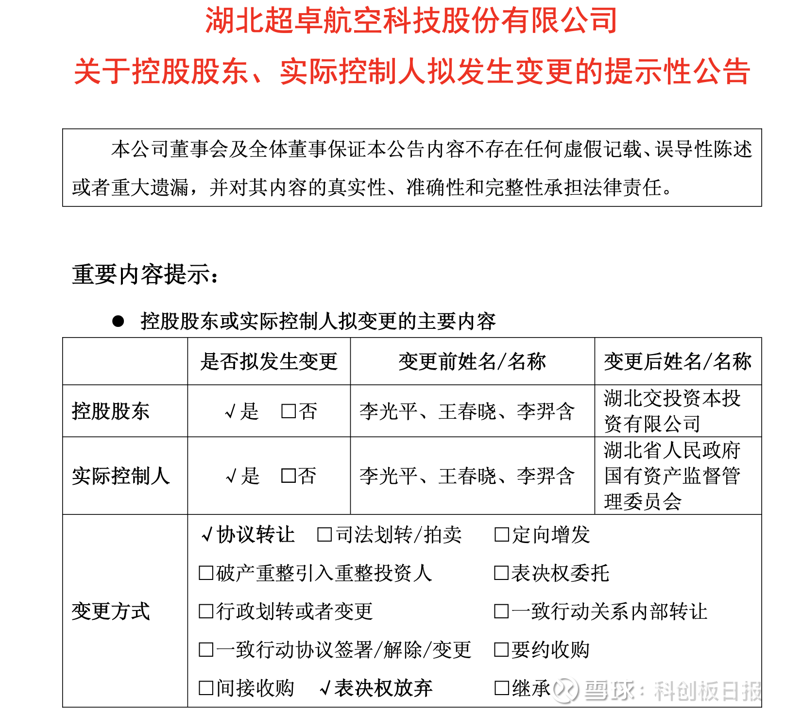 超卓航科披露称,本次协议转让完成后,公司控股股东将由李光平、王春晓、李羿含变更为湖北交投资本,公司实控人将由李光平、王春晓、李羿含变更为湖北省国资委。